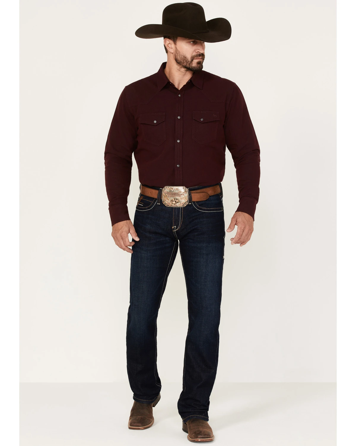 - Five-pocket design with embroidered details